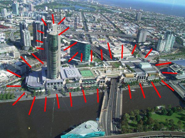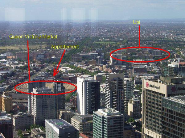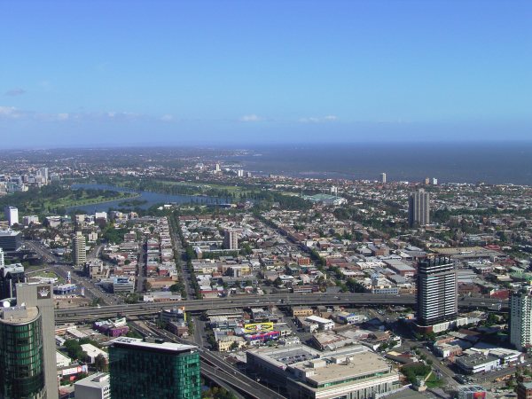 Ein Blick auf die Bucht. Der grüne Fleck links mit dem Teich ist übrigens "Albert Park". Da gewinnt unser Michael immer den großen Preis von Australien.